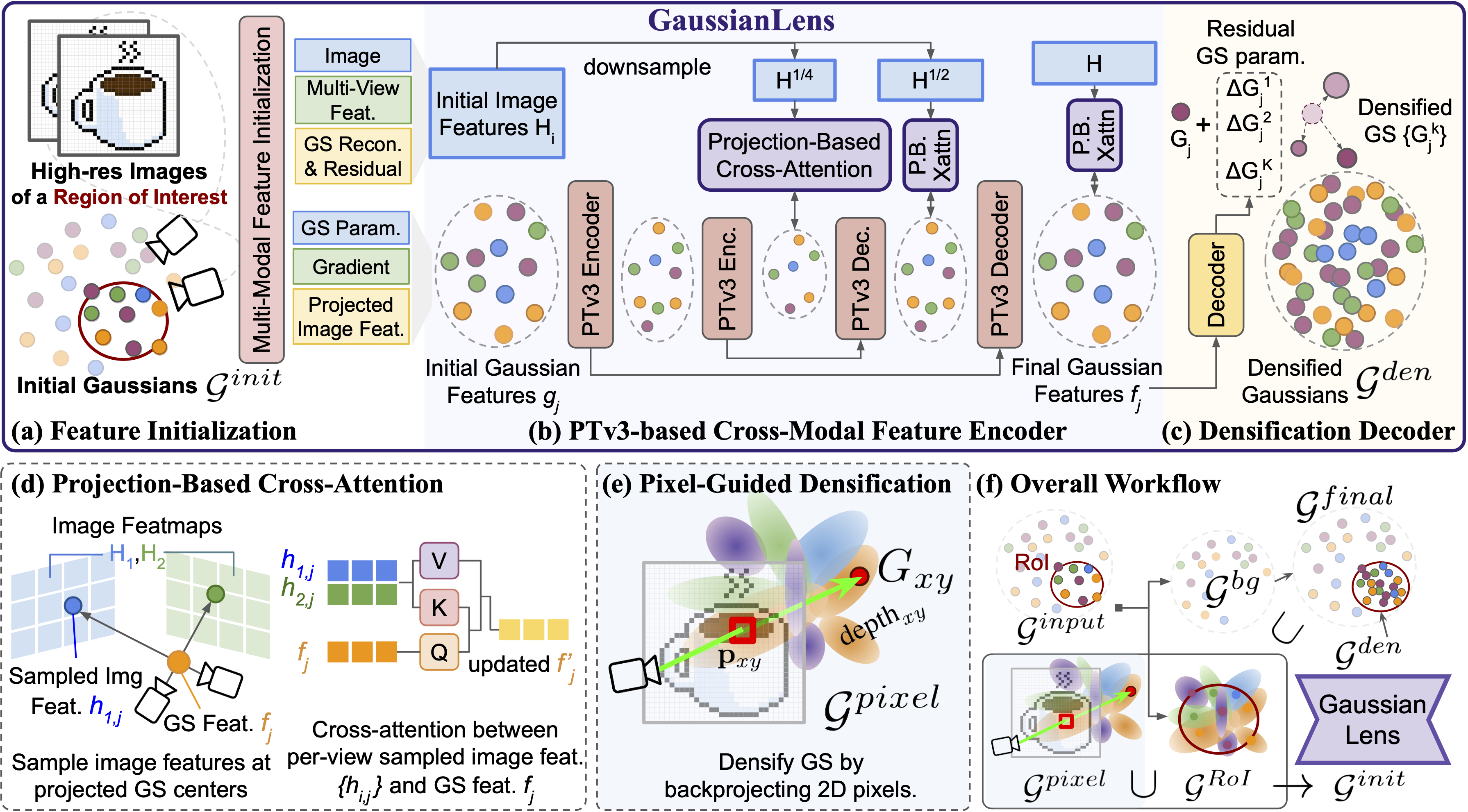 (a)-(d) illustrates GaussianLens, our feed-forward densification framework. It constructs multi-modal features for initial Gaussians and images (a), further extracts features via a PTv3-based encoder with projection-based cross attention (d) to images (b), and decodes them into residual parameters of densified Gaussians (c). (e) illustrates our pixel-guided densification. (f) shows the overall workflow.